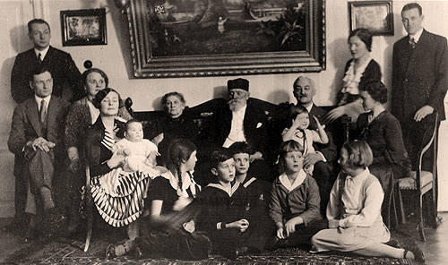 Beim Aussteigen griff Papa nach dem einzigen im Netz befindlichen Hut und stuelpte ihn ueber Da stoehnte Arthur: "Onkel Eduard!" Den neuen Hut hatte ein anderer mitgenommen und dieser war so uralt und abgeschabt, wie keiner von Papas "alter Garde". Peltzer Familie zur Feier des 90. Jahrestages der Robert Peltzer (Mitte), 1936