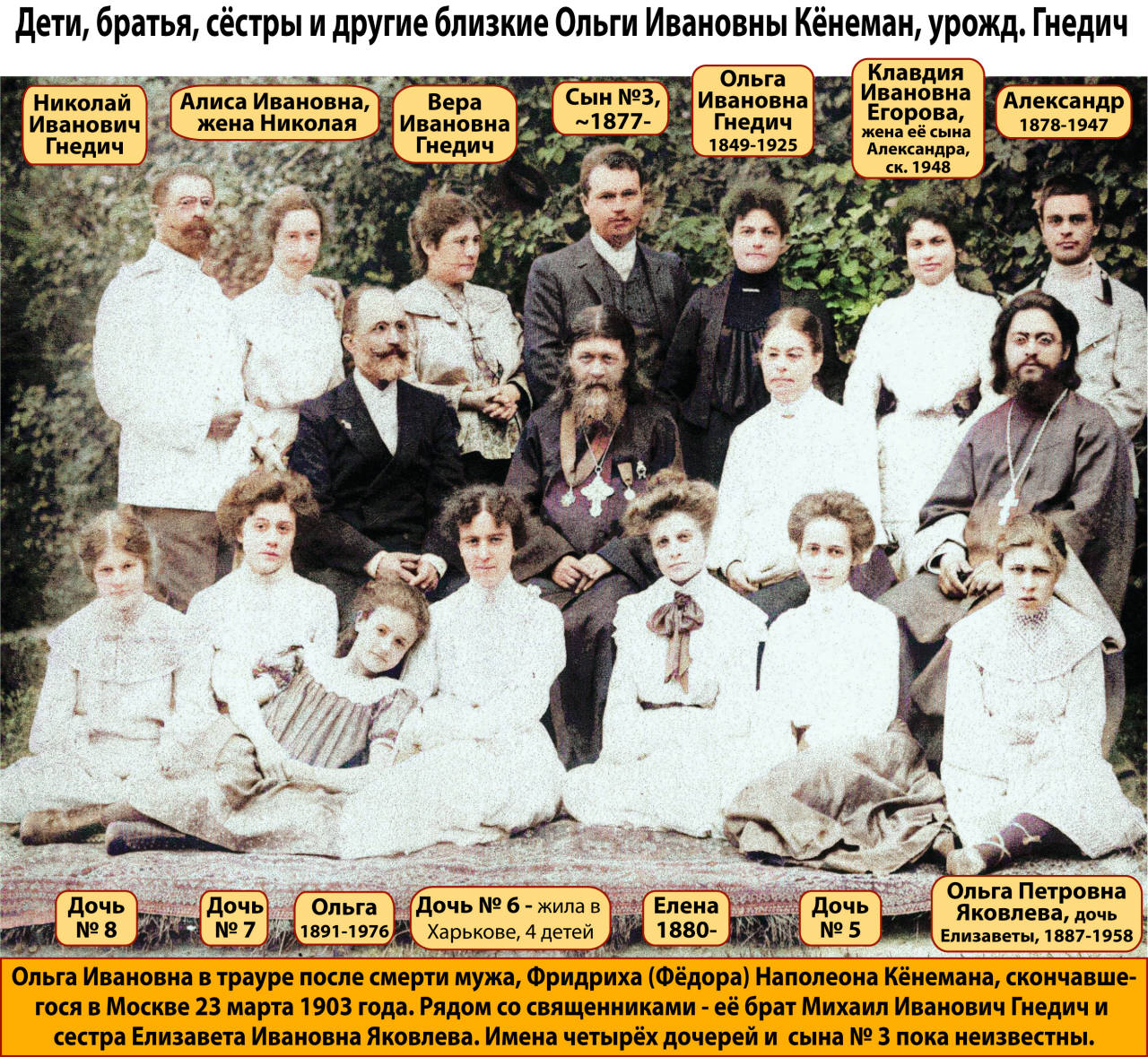 Лето 1903 года. Ольга Ивановна Кёнеман, урожд. Гнедич (в чёрном траурном платье), после потери мужа НАЧАЛО >>> Фотографии семьи Кёнеманов >>> Фото 1903 года - Ольга Ивановна, урожд. Гнедич, с детьми и родственниками. ![]()