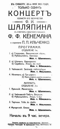 ![]() За год до окончания Московской Консерватории, в 1896 году, юный Фёдор Кёнеман познакомился с молодым певцом и своим тёзкой Фёдором Ивановичем Шаляпиным, который только что переехал из Санкт-Петербурга в Москву. В Петербурге Шаляпин пел в частном оперном театре Панаева, но, потрясённый его голосом, Савва Мамонтов соблазнил девятнадцатилетнего талантливого юношу московской сценой, а точнее - Московской частной оперой, где Фёдор Иванович сразу же стал ведущим артистом. Он пел Ивана Грозного в «Псковитянке» Н. Римского-Корсакова (1896), Досифея в «Хованщине» М. Мусоргского (1897), Бориса Годунова в одноименной опере М. Мусоргского (1898) и другие ведущие оперные партии. Со встречи на одном из московских музыкальных вечеров, постоянно организововашихся меценатом Саввой Мамонтовым в своём доме на Садовой Спасской улице, и началась невероятная дружба двух Фёдоров - Кёнемана и Шаляпина. Они были одногодки, оба с 1873-го года, но Шаляпин был старше Кёнемана на 66 дней. Фёдор Кёнеман рассказывал своей жене Александре (Шуре) Соколовой, что впервые увидел Шаляпина в ботинках на босу ногу, без галстука и в рубашке с растёгнутыми верхними пуговицами, что явно не соответствовало стилю одежды в аристократическом заведении Мамонтова, куда Шаляпин явился в первый раз, только что оказавшись в Москве. Но как только Шаляпин вышел и спел для гостей первое произведение, Кёнеман мгновенно был очарован его голосом и талантом исполнения, после чего вступил с ним в разговор и подружился. "Дорогой наш, любимейший Herr Kёnemann! Федюрочка разлюбезная! Вспоминаючи тебя, много сердцем вздыхаем, ибо любим тебя крепко-накрепко. До скорого свидания, милый друже! Твой Фёдор Шаляпин и Н. Авьерино",- написали в сохранившейся до наших дней открытке отдыхавшие на австрийском курорте Маринабаде в Чехии Шаляпин и скрипач-альтист Н.К Авьерино в июне 1912 года - в год, когда Фёдор Фёдорович Кёнеман стал профессором Московской Консерватории по классу фортепиано, и проработавший там до 1932 года. Кёнеман - великолепный композитор и пианист, и Шаляпин - легендарный русский актёр и бас - как словно по заказу судьбы встретились и слились на четверть века в совместном творчестве. Неизменно сопровождая Ф.И.Шаляпина на концертной эстраде, Ф.Ф.Кёнеман был не только его личным аккомпаниатором, но он же писал и музыку для песен, которые потом в исполнении Шаляпина обретали невероятную популярность. Творчество Кёнемана, как эстрадного композитора, наиболее ярко проявилось в написанной им и исполненной Шаляпиным балладе "Как король шёл на войну" (на слова М.Конопницкой), в концертной обработке бурлацкой песни "Эй, ухнем!" , в романсе "Три дороги" (тоже на слова М.Конопницкой) и романсе "Кузнец" на слова Скитальца. (О гастролях Кёнемана и Шаляпина в 1910 г.) На фотопортрете Фёдора Шаляпина, подаренном Кёнеману 1 декабря 1902 года, есть дарственная надпись: "От души - милому Фёдору Кёнеману с большим "спасибо" за чудесные романсы" Их совместное творчество продолжалась столько, сколько они вместе жили в России - 36 лет, до весны 1922 года, когда Фёдор Шаляпин иммигрировал во Францию, Париж. Шаляпин покинул родину со своими четырьмя детьми от первого брака и тремя - от второго, заручившись обещанием Дзержинского не трогать оставшихся в России его бывшую жену — Иолу Игнатьевну Торнаги-Шаляпину и их дочь Ирину. Дружба же их д