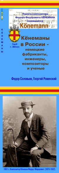 "Роскошной женщине от американца. Брак с Матрёной Ефремовной распался, и бывшая жена ушла из жизни Кёнеманов вместе с сыном Николаем, дочерью Марией, и их последующими поколениями, которые живут в настоящее время в Москве. Новый же брак композитора Фёдора Фёдоровича Кёнемана с Александрой Владимировной (20 марта 1896 - 12 октября 1987), на которой он женился в 1927 г., оказался невероятно удачным, хотя у них и не было детей. Тётя Шура, как её называли все остальные младшие родственники, пережила композитора на пятьдесят лет и стала хранительницей его творческого архива и организатором многочисленных выставок и юбилеев композитора как в музее Ф.И.Шаляпина в Москве, так и Краеведческом музее города Пушкино Московской области, где композитора чтут, как своего земляка - здесь, в загородном предместье Москвы, на даче он проводил десятилетия своей творческой жизни, устраивая ещё в дореволюционные годы творческие вечера, на которых выступал друг юности Фёдор Шаляпин. В настоящее время основная часть архива композитора Фёдора Фёдоровича Кёнемана, включая ноты, хранится в Российском Национальном Музее Музыки, Фонд № 60, Инв. № 181. Последняя частная обитель Кёнеманов в Москве - квартира с тремя окошками его младшей сестры Ольги Фёдоровны Соловьёвой на первом этаже по Большому Знаменскому переулку отошла в связи с её смертью в 1976 году государству. За сто лет предки Фёдора Кёнемана создали и потеряли в России огромное состояние. В двадцатых годах 19 века во время бума строительства суконных предприятий в России (вызванного повышением налогов на импортный текстиль), в Москву переехало семейство Фридриха Вильгельма Кёнемана, его жены Адельгейд (Аделаиды) Гертруды Пельтцер и их восьмерых детей. Оставив свой дом в пограничном Голландско-Австрийско-Французско-Прусско-Бельгийском города Эйпен (Eupen), переходившим с 18 по 20 век от одной державы Европы к другой, они решили с большей выгодой использовать свои капиталы, ремёсла и знания для создания текстильных предприятий в России, работающих в те времена от водяного привода типа "мельничного" колеса. Так, у одного из сыновей Фридриха Кёнемана, - Виктора Александра Кёнемана (1804-1885), или, как его именовали по-русски, Виктора Фёдоровича (будущего деда композитора Фёдора Кёнемана) в 1832 году появилась суконная фабрика в селе Каблуково Богородского уезда Московской губернии. Полученные доходы позволили Виктору Кёнеману стать к 1842 году Богородским купцом 3-ей Гильдии, а позже - 2-ой Гильдии. В 1845 году на его фабрике с двумя водяными приводами в Каблукове работало 36 станов, 28 жаккардовых машин и 182 рабочих. Сукна производилось на 90 тысяч рублей в год! Была у него суконная фабрика и в Москве, о чём свидетельствуют товарные пломбы, найденные историком и краеведом Богородского уезда Александром Послыхалиным. Место для фабрики в этом районе Богородского уезда было выбрано Кёнеманами из-за удобства с поставкой сырья. Близлежащие земли были известны произраставшим льном и развитым ткацким и суконным производством. Ещё царь Иван Третий переселял в эти края близ современного города Фрязина феодосийских ткачей, потомков франков (фрязинов-генуэзцев) для развития ткачества. Хозяин жил с семьёй в доме прямо на территории предприятия на берегу речки Воря, под сенью стоящей высоко над поймой знаменитой каблуковской церкви Спас